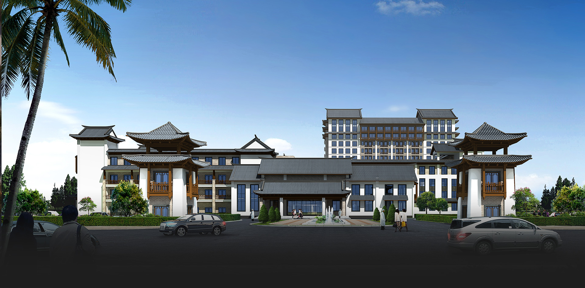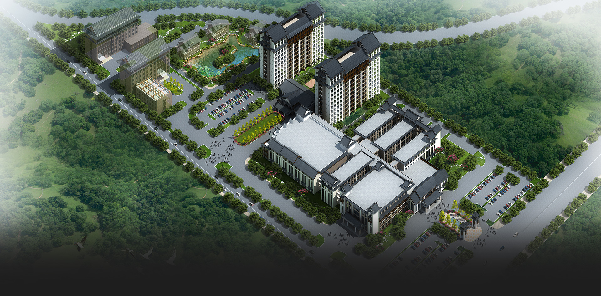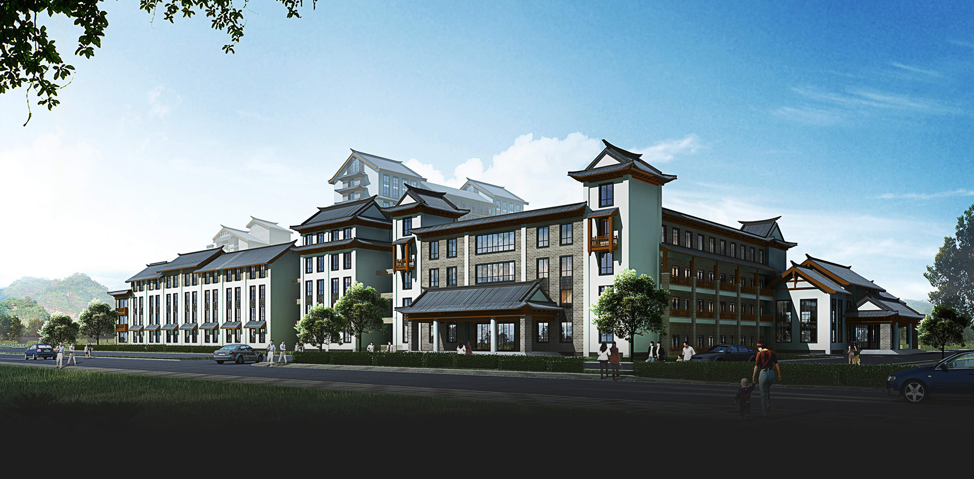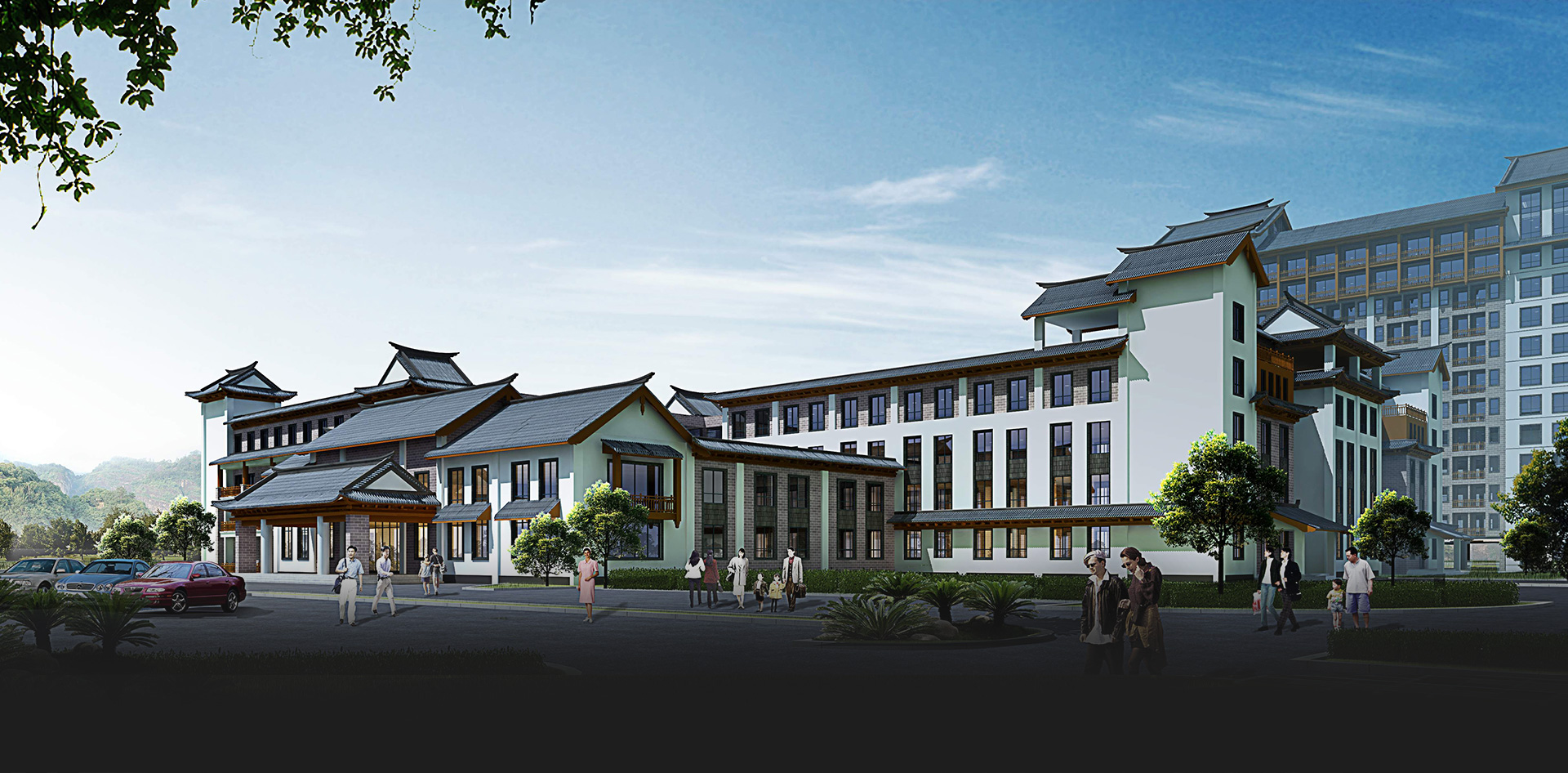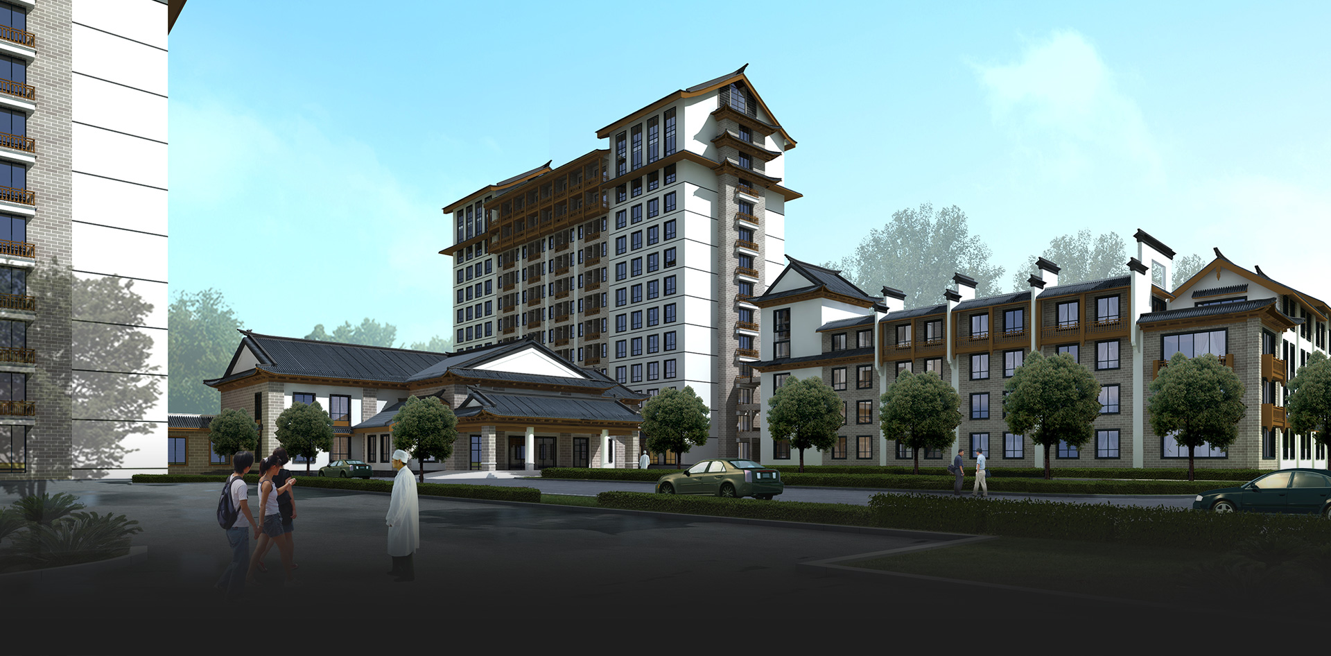 本方案采用现代设计手法依地形高差对医院建筑进行整体设计,结合彝人古镇建筑和园林的特色进行总体布局。通过中轴对称和疏密有致的布置方式,使得整个医院建筑群产生强烈的向心感,突出医疗区的中心地位。加上建筑单体的优美舒展、高低错落和庭院的围合,使得医院建筑群体形象典雅而舒展,高贵而亲切。