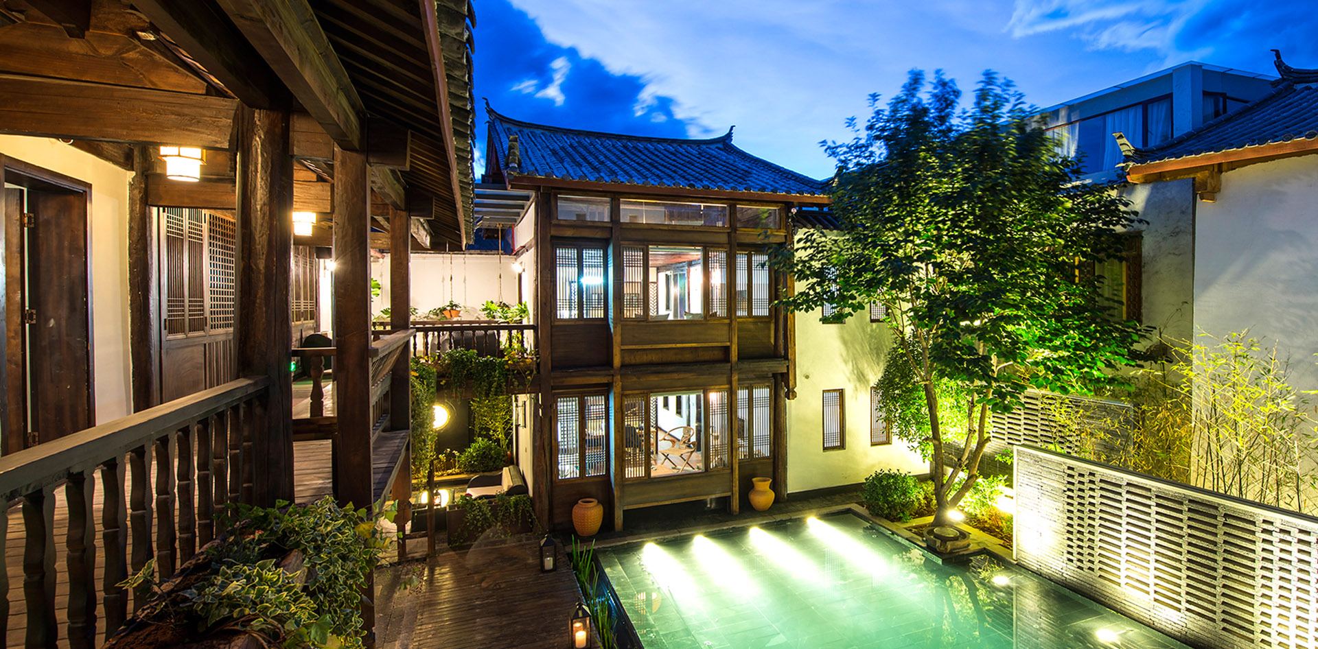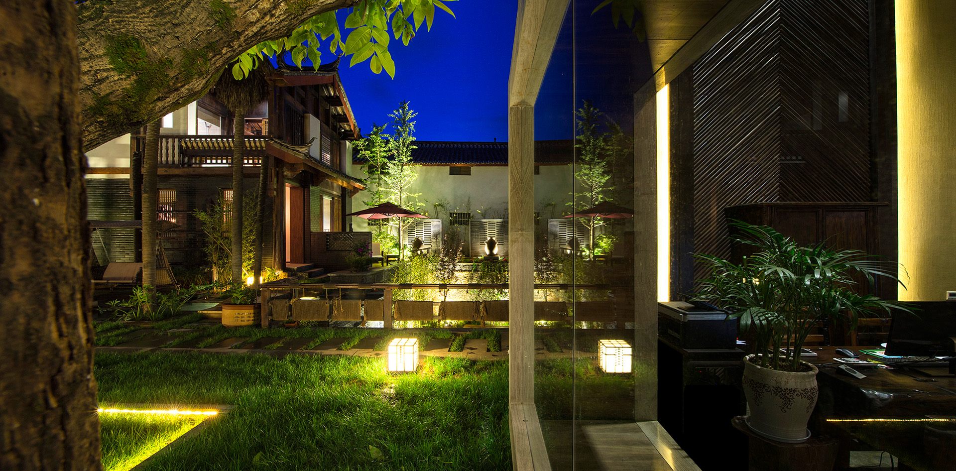 酒店主院东院的绿化带呈回字形,在回字的中心,放置着一个圆鼎,体现了中式禅意圆中有方,方中有圆。 下沉式景观以其对局限空间内高低落差的巧妙应用,使绿化景观在有限的面积内得到了最大限度的利用。且亭打造了一个200平方米的下沉空间,沿梯而下,仿如置身“谷底”,园中园除了有园林景观,还没有舒适的休息区,通过日式亲水平台、房间露台等半开放式空间,营造出一种亲近大自然的空间效果。