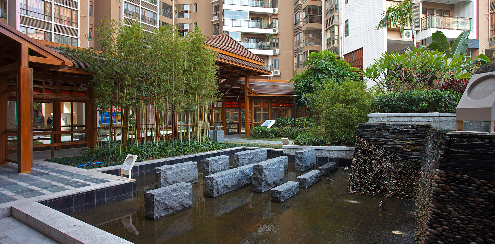 借鉴中式古典的造园手法,融合传统日本庭院的精髓,建造现代感强的“新和式庭院”!灵感取自“海北友松的画”,把中心庭院设计成“静谧的”白砂青松和“动感的”阳光草坪两部分,通过“石透廊”连接,性格迥异的两个空间,配置条纹状的葛石,连接苔藓丘地和造型独特的罗汉松,营造“和隐”和“优美”的枯山水庭院。