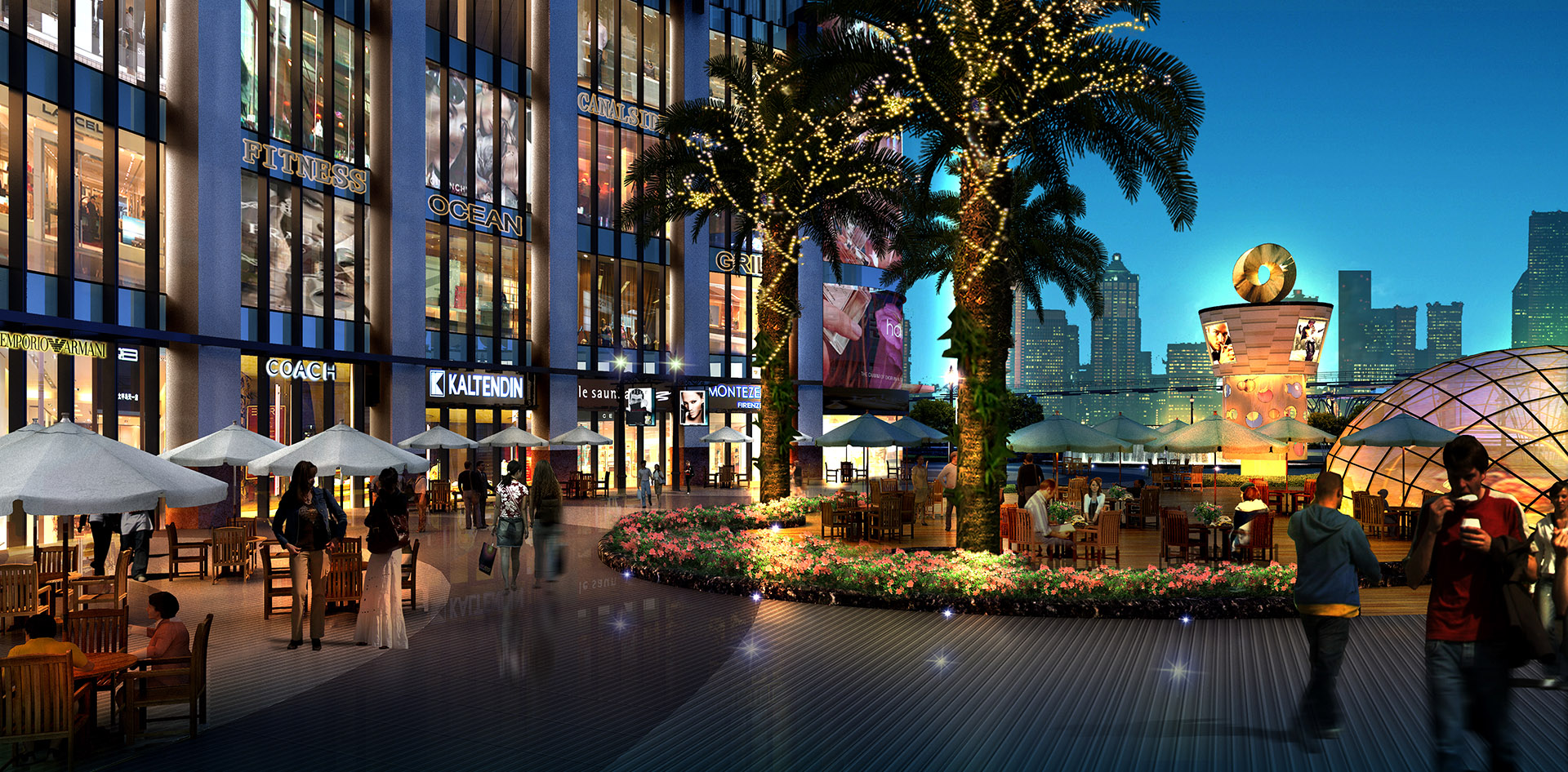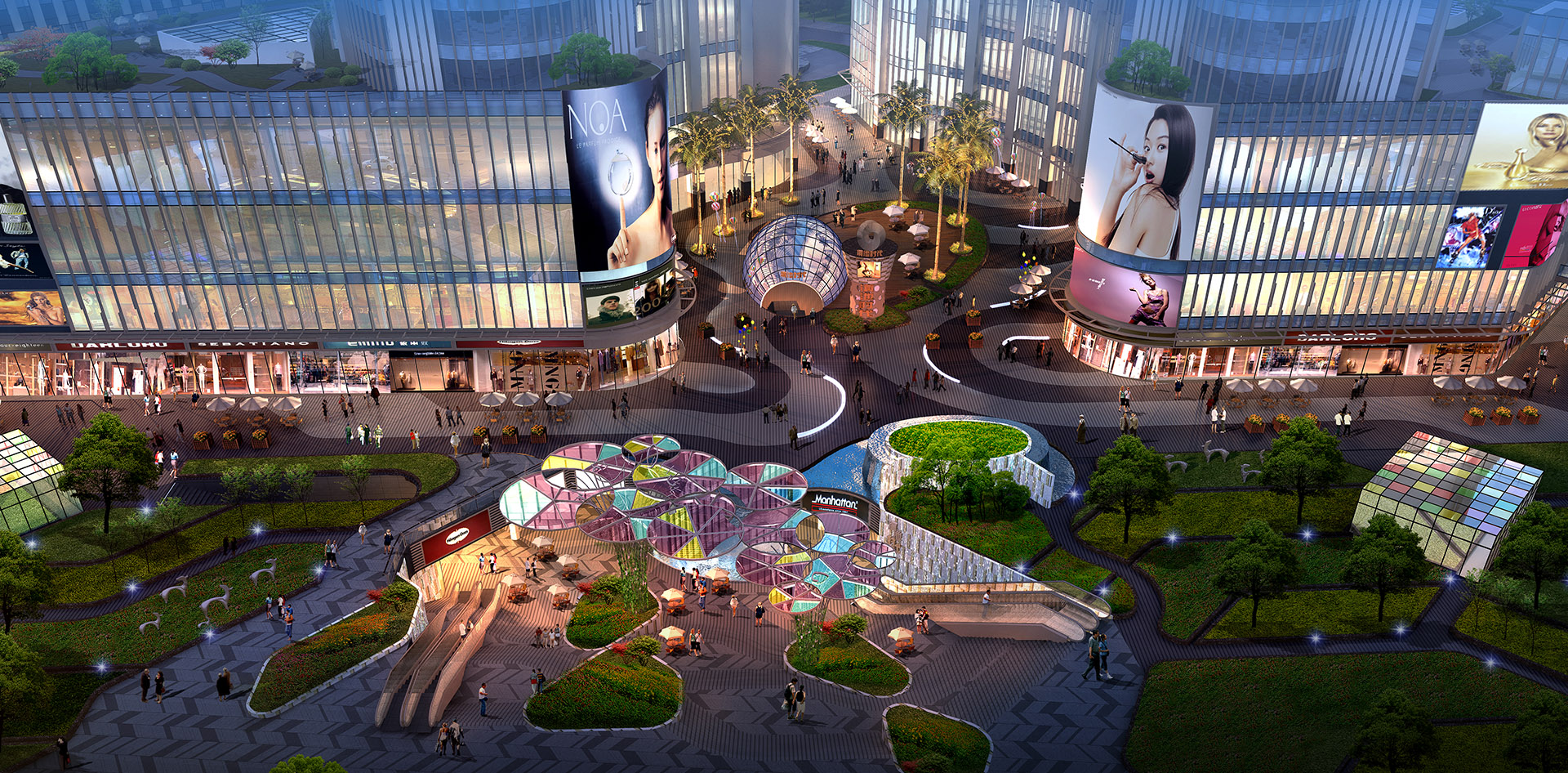 项目设计定位为“流线型穿越”。流线是自然、纯朴的,通过强烈的流线型导向景观及现代商住景观文化的沉淀,使人们沉浸在洋溢着现代特色与昆明文化气息的氛围中,尽情感受人性化的流线商业空间。以“流线型穿越”为题,入口大型下沉广场设计了波浪起伏的阶梯与不规则花池结合的景观,沿街绿化是独特的流线型层级植被,铺装的材料和颜色标示着场地空间交通流线的位置和走向。