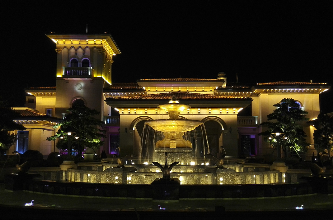 设计范围为主入口大门、园林景观、会所建筑,澳门投资者看好大陆的经济发展能力,了解消费人群密度,相信高尔夫运动的魅力能吸引更多的豪客,为江门五邑带来更多的经济效益,设计师希望用夜晚的灯光,让顾客感受五邑高尔夫独特的尊贵身份,享受宫廷级的服务,彰显生活气度,成就圆满人生,耀眼江门。