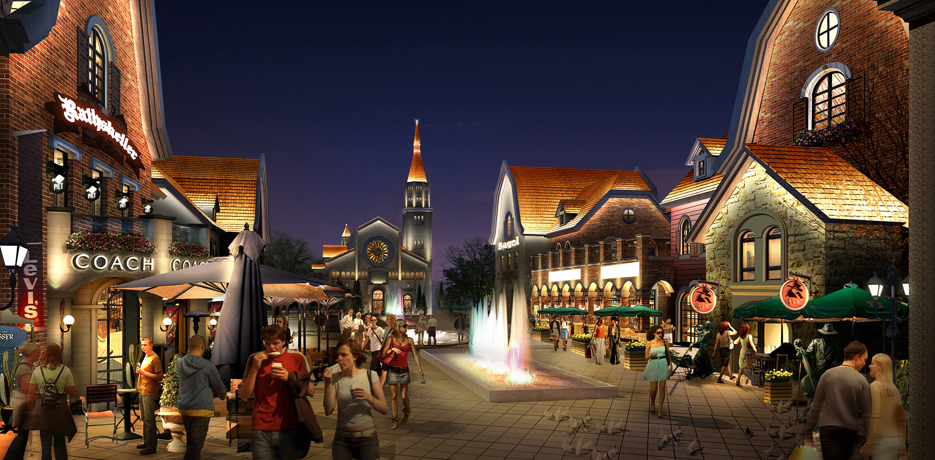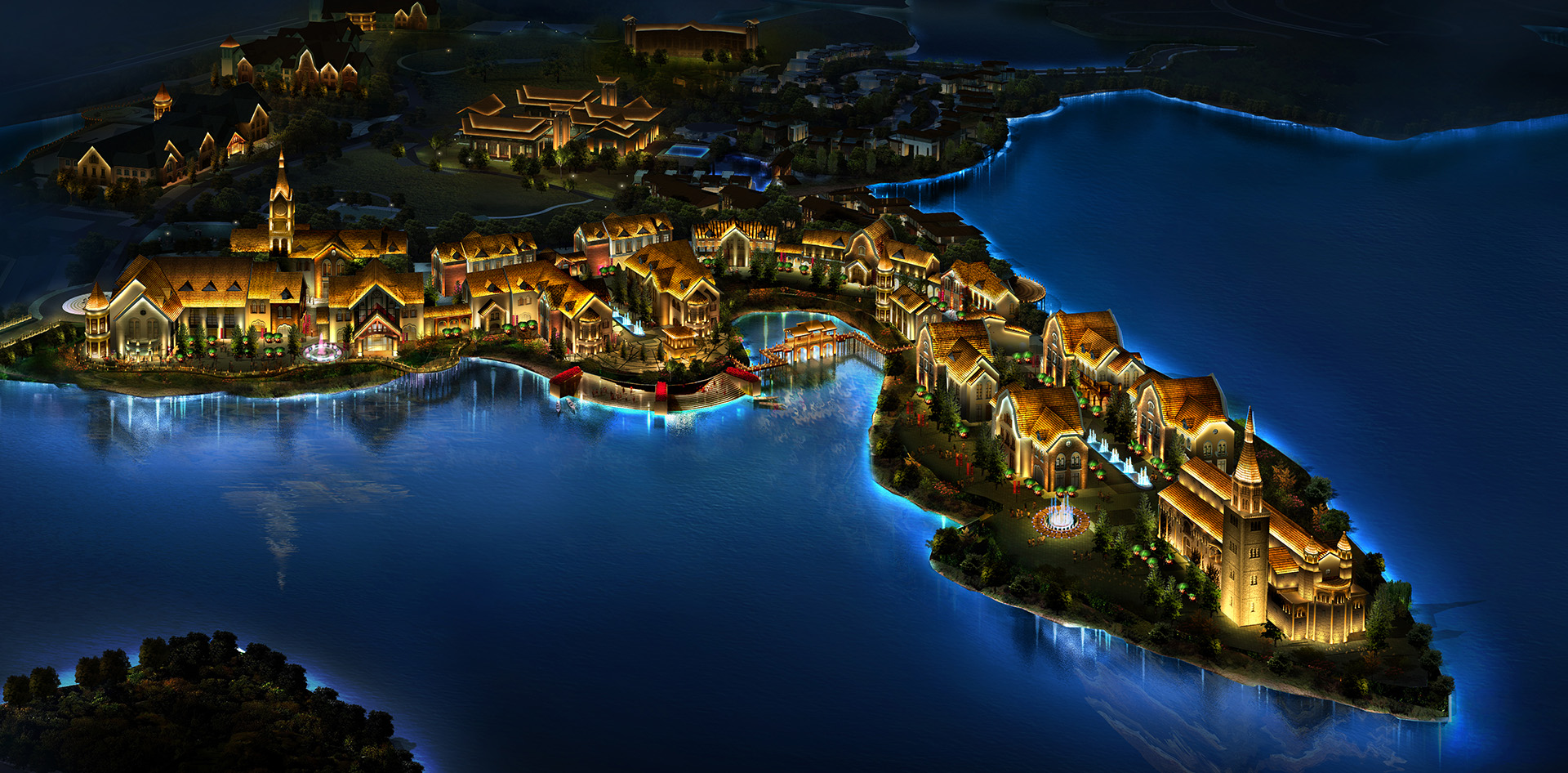 方案围绕“人间胜仙境,星光耀天湖”的灯光主题概念展开,强调夜景游线景观轴线视觉,作为超大型的综合体旅游地产项目,灯光方案结合欧洲建筑特点、企业的品牌定位等,充分体现其时尚性、趣味性、品牌展示性、舒适性及人文历史,分别从四季、庆典、星光三种模式表达。