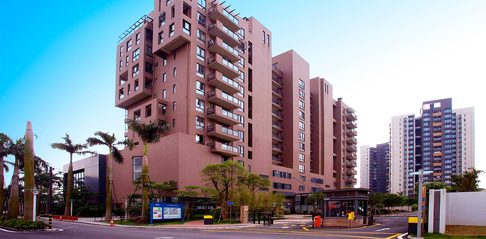 总体布局东面以低层的单栋、联排别墅,西面布置高层住宅,地块中间布置景观视野最好的大户型单栋高层,达成了大部分住户东向或东南向望江的视觉享受。利用低密度的高层建筑布置方式,最大化的提升公共绿化空间,底层进行了架空处理,营造了连通的绿化和空间系统,共有六大组团园林,形成了外江内湖的景观享受,表达与自然和谐共处的国际主题。