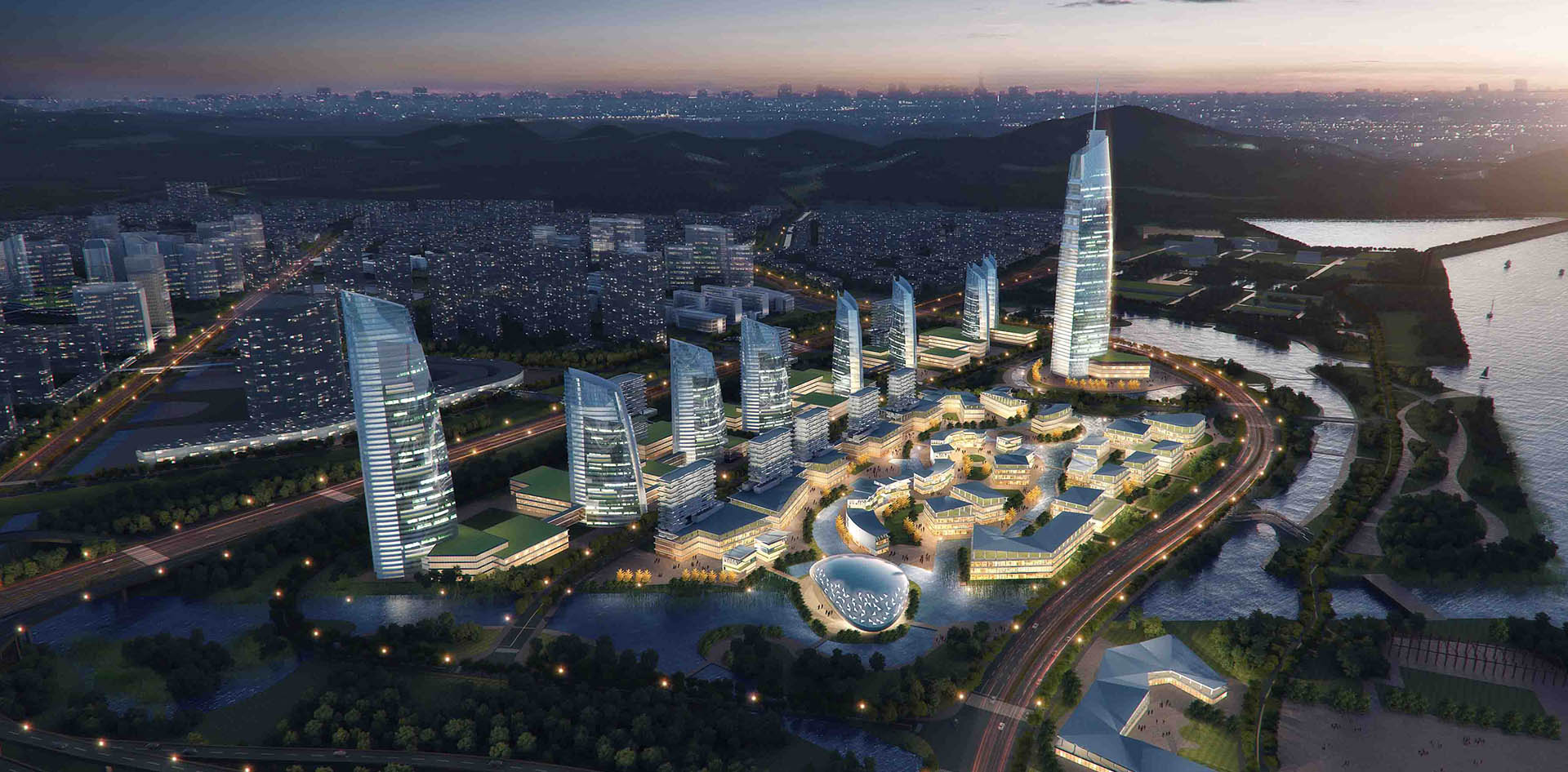 规划提出四个设计原则:一是增加跨江的通道,同时有效分离过境交通与基地内部交通;二是承继海塘文化,以沿江、沿高速两条海绵设施带;三是北片区把文化中心置换为城市公园,滨江极地海洋世界地块打造结合旅游、文化、娱乐、生态及商业的“钱江帆影”项目;四是南片区以“灵山—钱塘江”山水格局为本底串联公共空间,“灵山探海”轴与钱塘江交汇处设置浙江文化中心,力求打造浙江省文化高地。