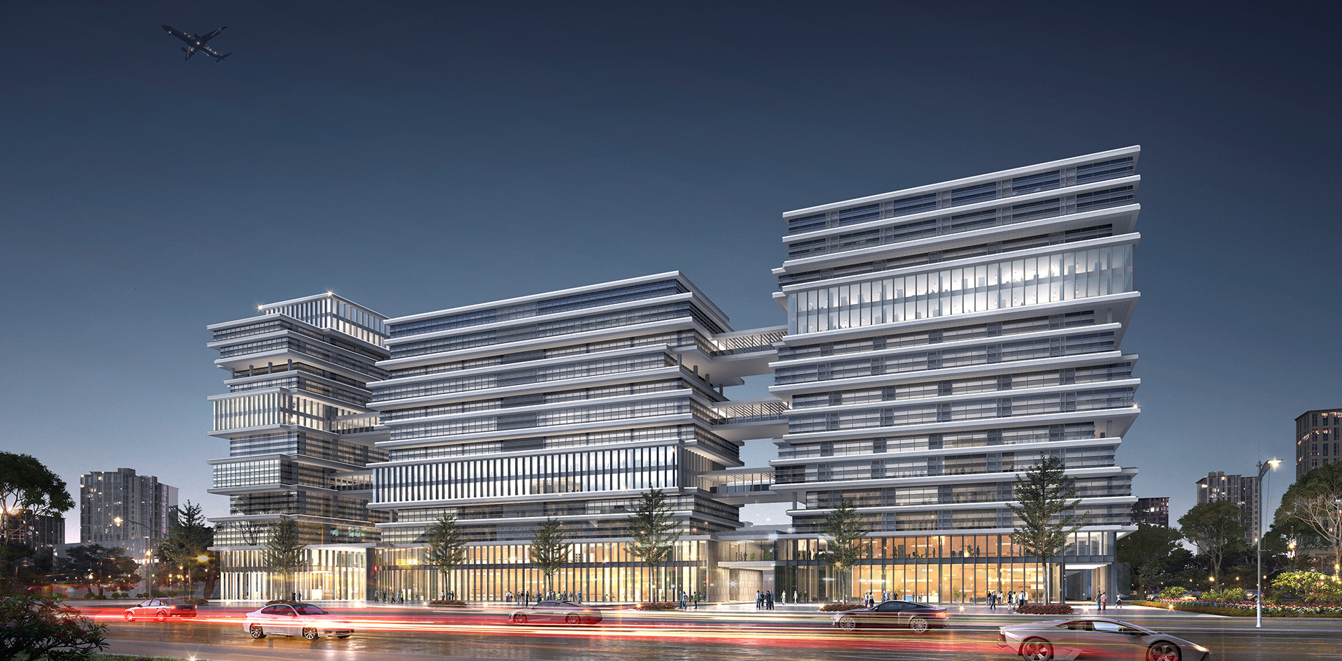 项目以极简的科技魔方堆叠设计理念,利用层层错的处理手法,打造立体景观式的城市花园,通过丰富的空中连廊,让分散的建筑形成流动的整体,灵动有趣的造型,将成为别具一格的城市天际线。现代、时尚的建筑形象,外观简约、通透,特色的大面积落地窗,寓以科技魔方,科技之窗,展示着世界最前沿的技术创新,项目本身也成为一件具备观赏价值的艺术品,外立面可随着灯光的变化,现不同的色彩和建筑魅力。
