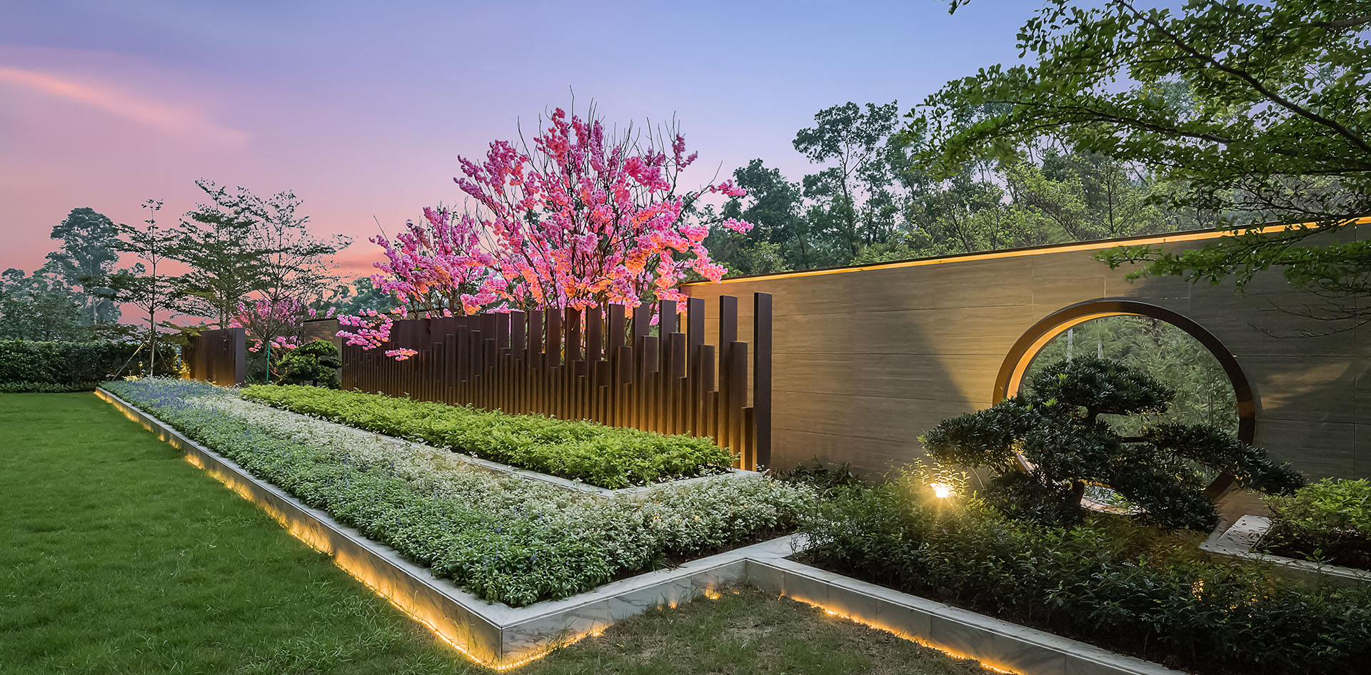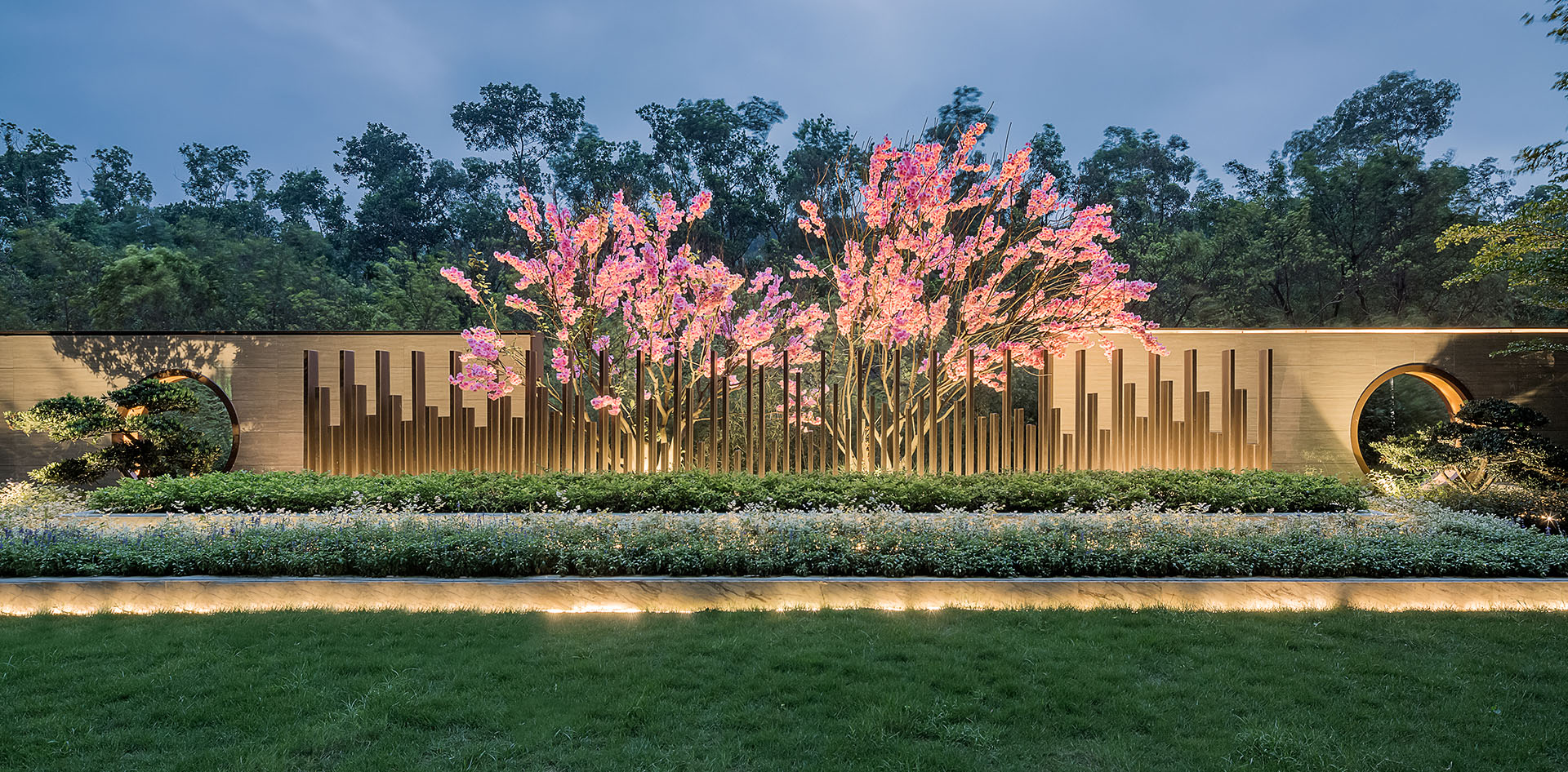 本项目呈现规则的景观空间布局,同时达到极好的城市展示效果,将舒适性,参与性,品质性一一体现。项目将中山独特的自然、文化资源加以运用,提炼出 "山”和“水”这两种能代表中山特色的设计元素,以“院落式”递进空间营造东方文化脉络新感官,打造景观礼序的”尊贵“体验之旅,形成“山水中的诗意栖居”为设计理念的复合型的景观花园空间。