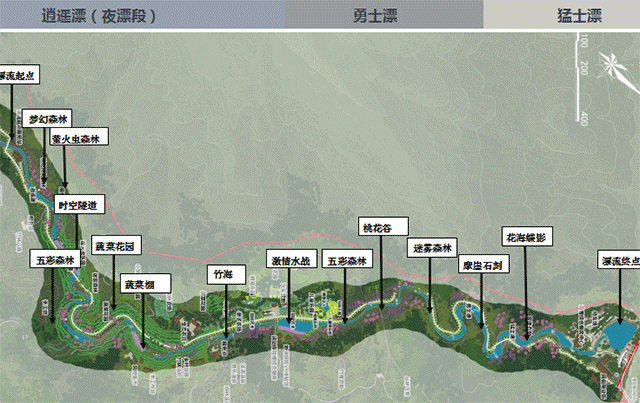 逍遥漂夹岸有梦幻桃林、五彩蔬果廊、天鹅绒紫薇花园、生态休闲公园,让游客如游梦幻花涧,自在逍遥;奇幻漂水流湍急,河道有恐龙觅食、蟒蛇喷水、巨鳄游弋、青蛙吐雾、神龟镇守,让您如闯奇幻丛林,惊险刺激;勇士漂是最刺激的漂流滑道,长滑道、高落差、连续弯道为省内首创,游客在峡谷中飞流直下,一路尖叫到终点。