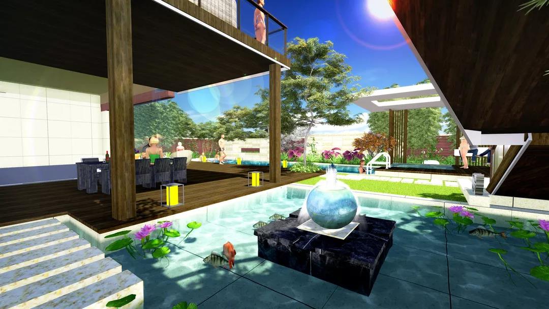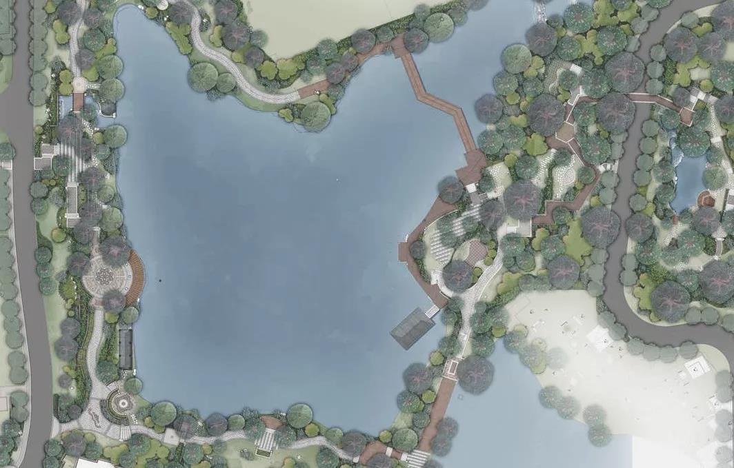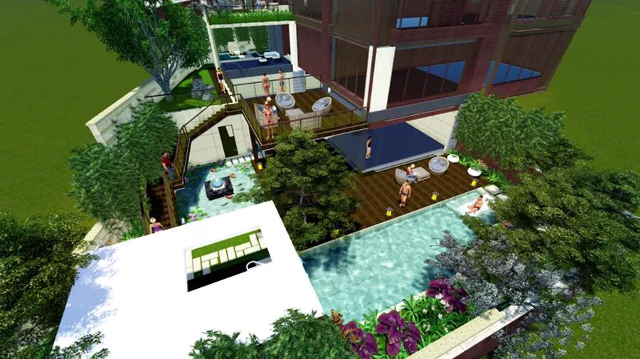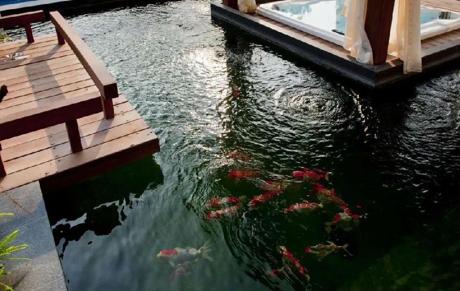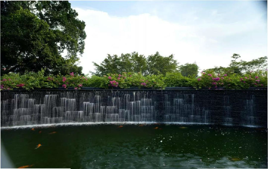 远离尘世,回归自然。水池清气沁人心肺,冲涤心中的烦躁。在高低错落的地形上,巧妙地在幽静的小湖的源头设计跌水的瀑布对景,让平静的湖面增加一丝丝的活跃气氛。