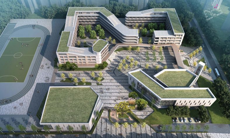 大中纺织有限公司三旧改造项目(中小学部分),打造以校园入口到操场的景观轴线,同时释放更多的公共绿地形成有仪式感与活力的生态型绿色校园。