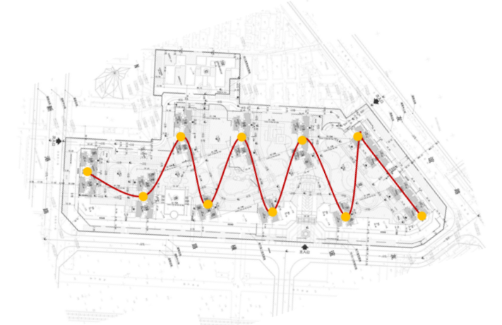 项目地块呈南北长东西短的狭长不规则形状,考虑到传统的行列式布局容易将空间分割得零碎,不利于整体景观的打造,甚至难以满足楼面日照间距需求的问题,规划运用了错位折线布局。