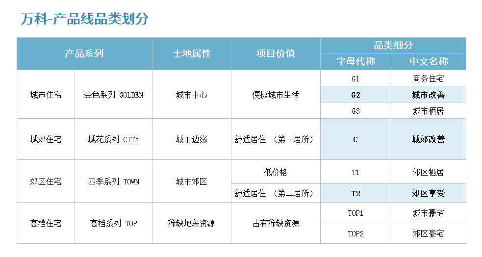 万科旗下开发的住宅项目分有四大品类,G1、G2、T2系列以地理位置(距市中心的远近)为划分依据,交通便捷度与配套完善度随之降低。第四类TOP系列则以对稀缺资源的占有为划分,与前三类形成差异与互补。