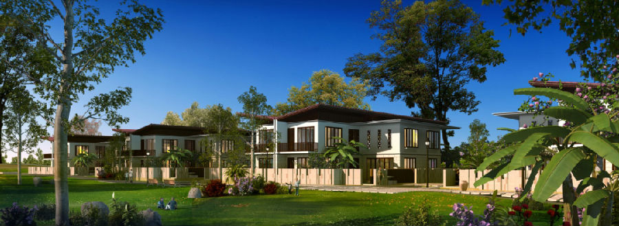 为此,二期项目采用了休闲、舒适、自在为主要意境特色的现代东南亚建筑风格,并提出别墅与小高层搭配的社区结构。其中A、B型为两层住宅,每户别墅单位设计在200平米左右,四户为一小组团;C型为9层住宅,底层局部架空,地下室设有设备房和地下车库。