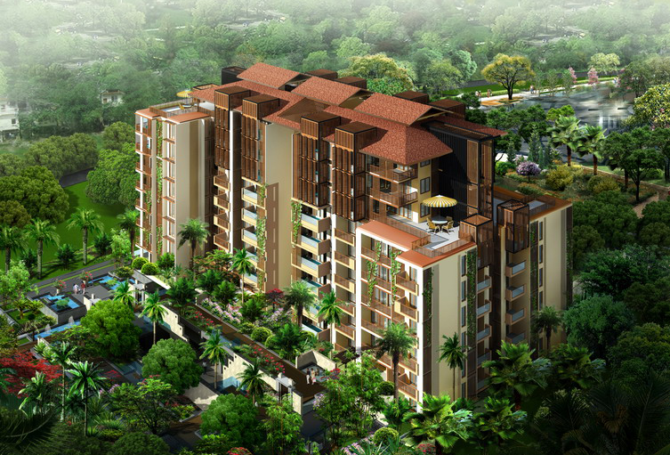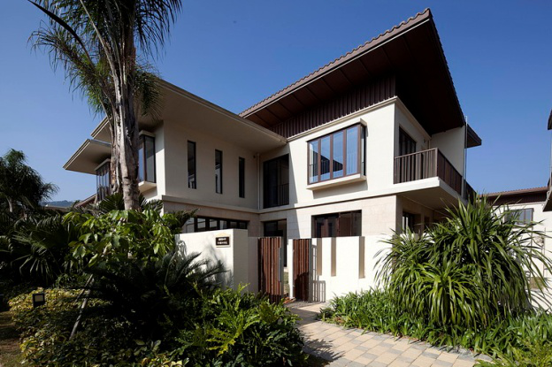 建筑设计上使用了大量东南亚现代建筑元素,包括有落地大面积玻璃门窗、平板大挑檐、铝合金装饰格栅等。