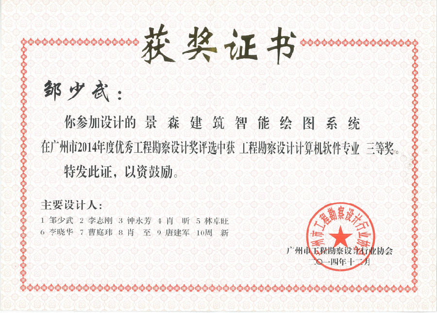 广州市2014年度优秀工程勘察设计奖计算机软件专二等奖