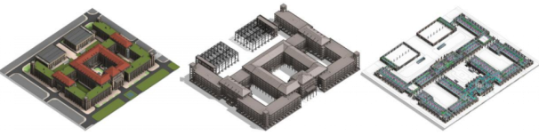 图:从左至右依次为建筑模型、结构模型、机电模型