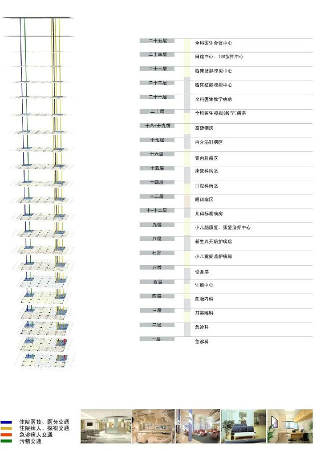 急诊、全科医生临床培养基地、儿科中心、住院病房等,既有各自独立的竖向交通共呢个横向连接,功能串联、洁污分流、人流的通畅和便利、引导和管理形成紧凑的系统,构建成功能流程的框架。