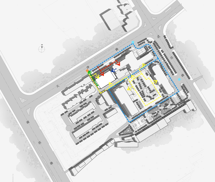 同时,考虑到在新时代生态文明建设的背景下,绿色城市更新必将成为城市发展的重要方向,设计团队提出,从规划全局出发,实现重要医技资源共享,缩短功能流程,最大化的实现高效、可持续发展的目的,建立“绿色医院”。
