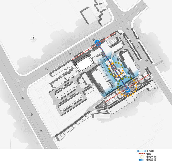 项目北侧与城市主干道相接,人流车流量大;项目与医院原有建筑基地东、南、西侧均有已建建筑,如何合理利用此狭小地块成为规划设计的难点;如何在建设拟建建筑时又不影响已建医院建筑的使用,解决建筑的可持续发展性是规划设计的难点。