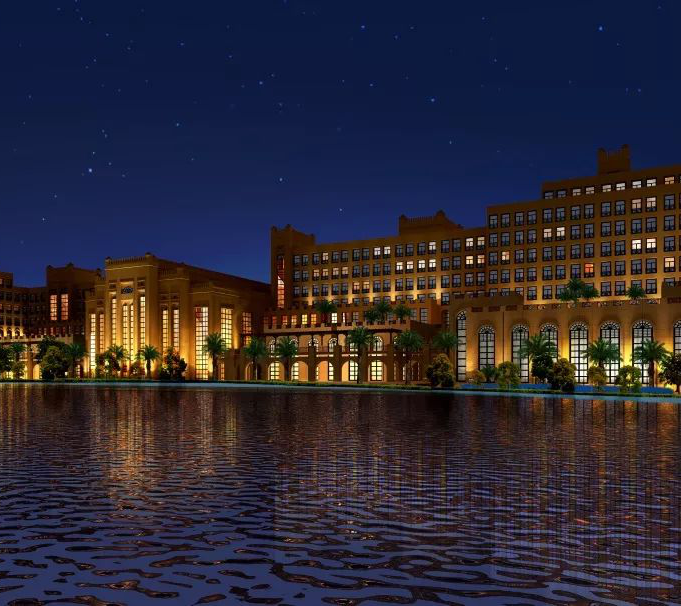 在水景设计中,设计者服从原有自然水景景观,自然水景线与周边环境水体的空间关系,正确利用借景、对景等手法,既充分体现所在本土自然景观的美学特征,也表现酒店建筑的特色,在充分挖掘本土资源的条件下,达到酒店的建筑形象与环境和谐统一的美学效果。