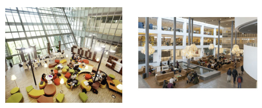 传统教学楼的方式仅仅解决了教与学的关系,没有注意到二者各自之间的交流,教学楼内应该提供给早到的学生一个可以继续学习的场所,它可以容纳一部分图书馆功能,可以提供给学生们一个休息的场所,一个互动的空间。