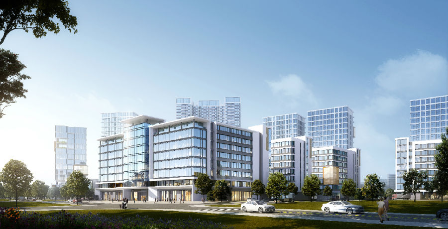 百米研发厂房沿北侧金和街布置,园区中心设置超大生态湖景,为园区营造了绝佳的办公生活环境,生产性厂房沿隆盛路两侧成组布置。整个园区规划分区明确,建筑北高南低,高低有序,丰富的天际线引领着城市新高度。