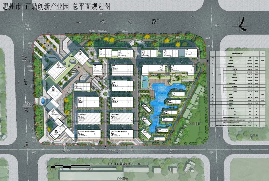 本项目总规划建筑面积约40.2万平方,立足于打造创新型的智能科技园区。金龙大道和一号公路正作为惠州市重点城市升级地段,本项目又处在两条道路交汇处,既占据地利,又对本项目的展示形象提出了更高要求。